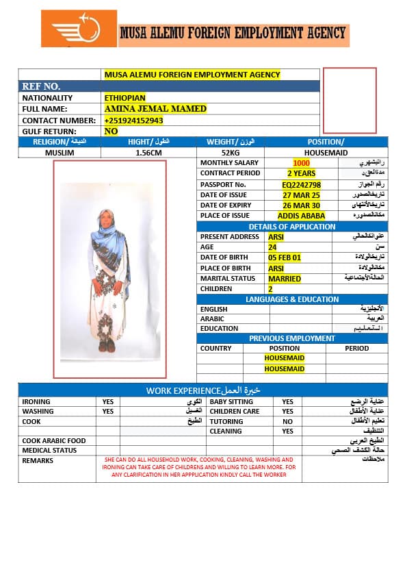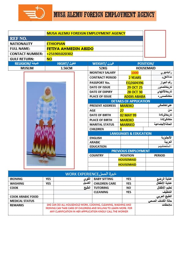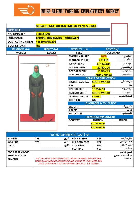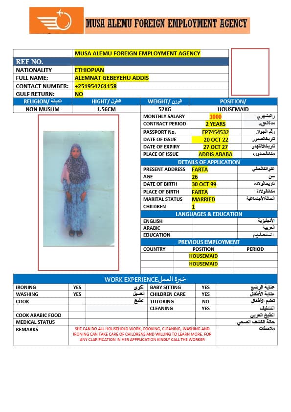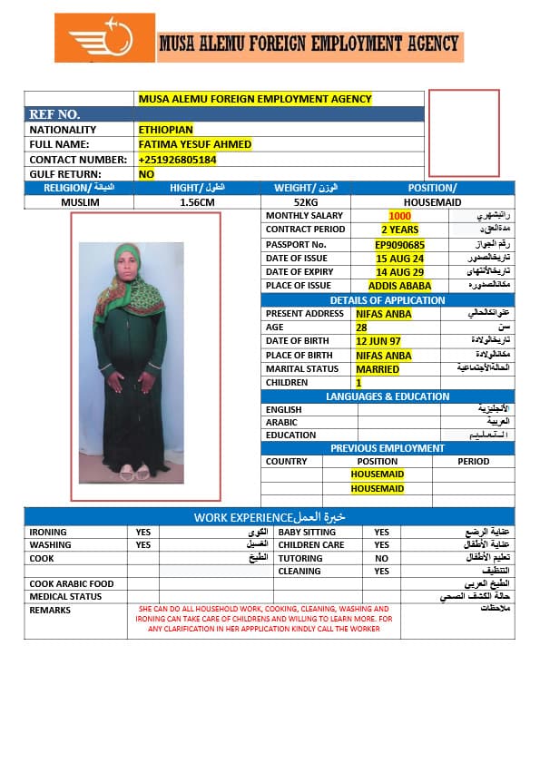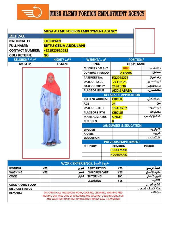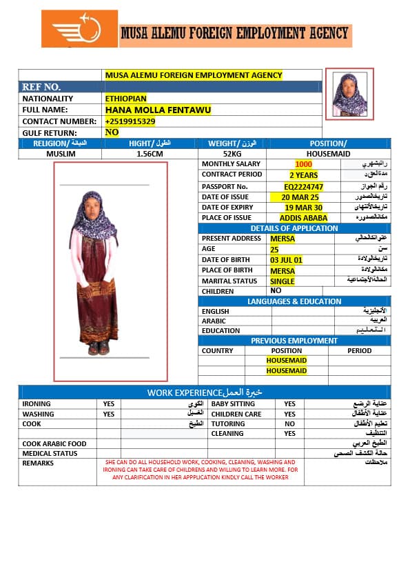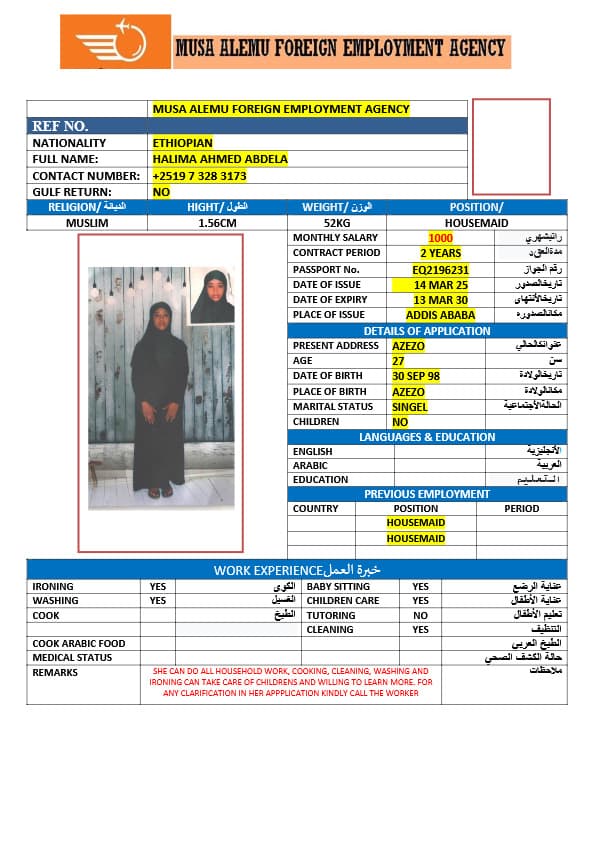 احصل على خدمة استقدام عاملة منزلية من أثيوبيا عبر النجوم المميزة بأعلى معايير الجودة والشفافية. نقدّم لك قوائم سير ذاتية لعمالة منزلية إثيوبية مع تفاصيل الخبرة والمهارات والسعر الشهري، مما يمكّنك من اختيار العاملة المناسبة لاحتياجات منزلك بكل ثقة وسهولة. مع خدماتنا، تضمن إجراءات نظامية، دعم كامل، متابعة خطوة بخطوة، واختيار أمثل من بين العديد من المرشحات المؤهلات للعمل في المنازل. ابدأ الآن واستفيد من استقدام موثوق وسريع بأسعار تنافسية!