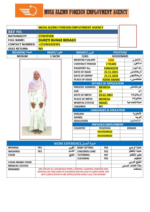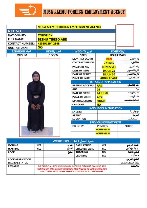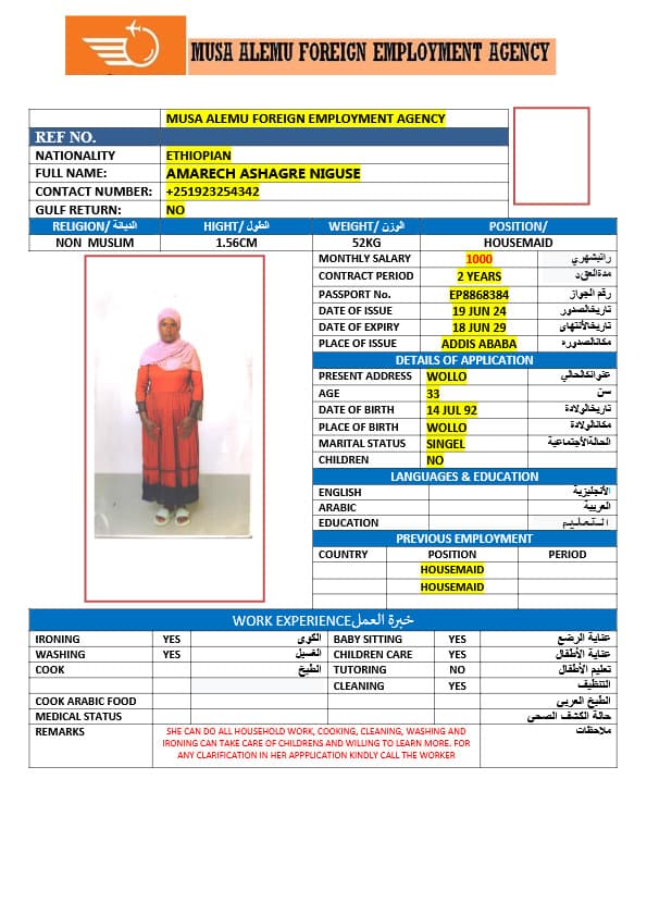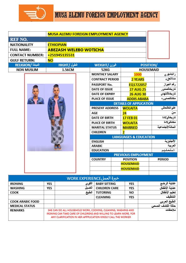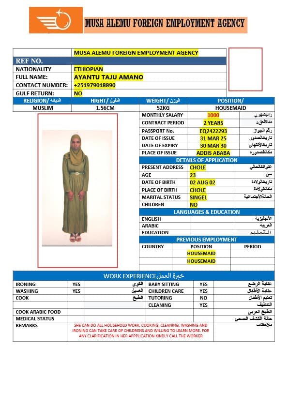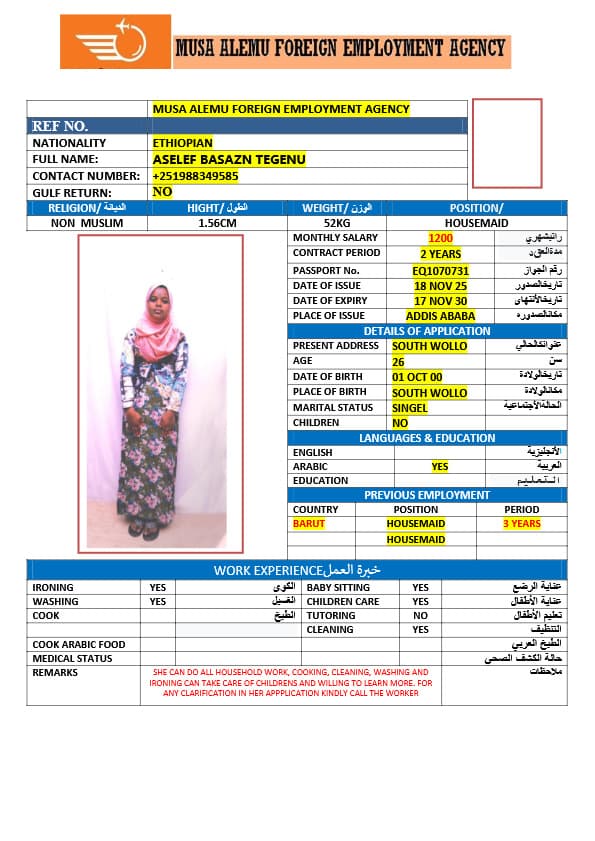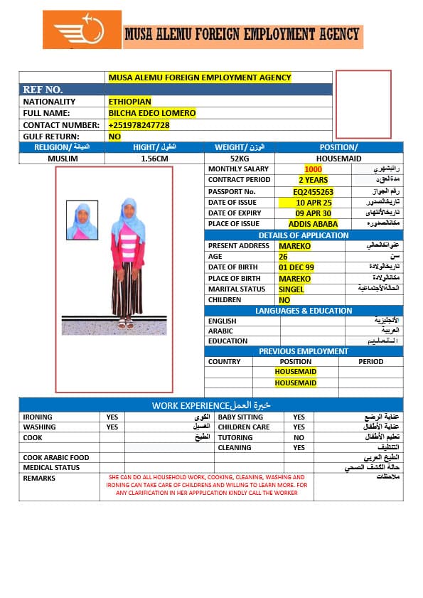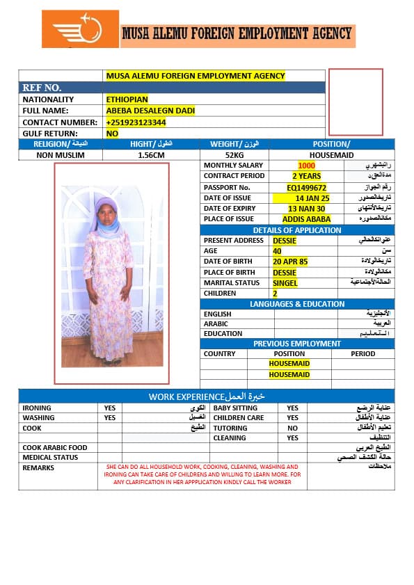 احصل على خدمة استقدام عاملة منزلية من أثيوبيا عبر النجوم المميزة بأعلى معايير الجودة والشفافية. نقدّم لك قوائم سير ذاتية لعمالة منزلية إثيوبية مع تفاصيل الخبرة والمهارات والسعر الشهري، مما يمكّنك من اختيار العاملة المناسبة لاحتياجات منزلك بكل ثقة وسهولة. مع خدماتنا، تضمن إجراءات نظامية، دعم كامل، متابعة خطوة بخطوة، واختيار أمثل من بين العديد من المرشحات المؤهلات للعمل في المنازل. ابدأ الآن واستفيد من استقدام موثوق وسريع بأسعار تنافسية!