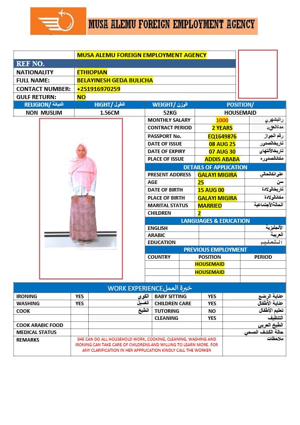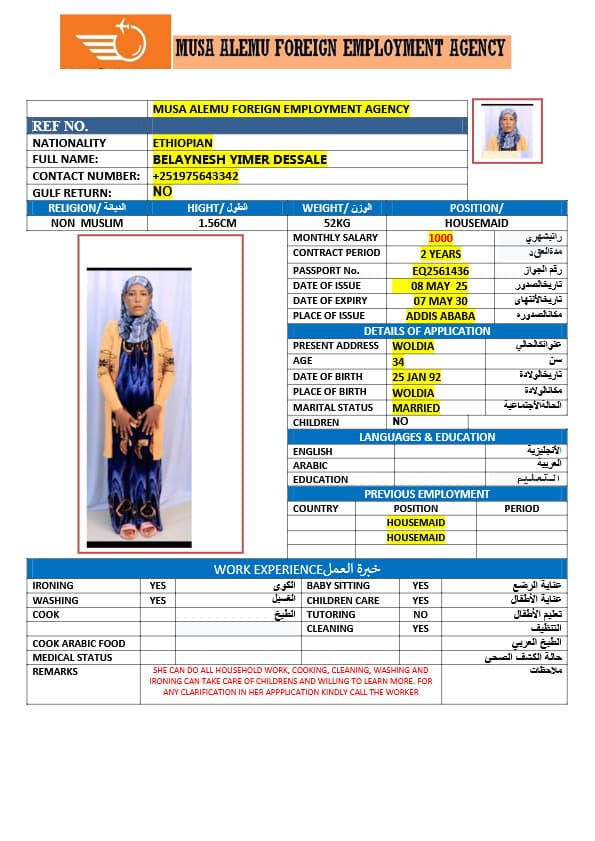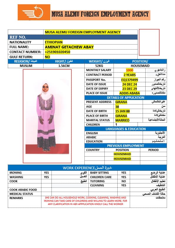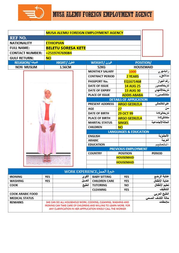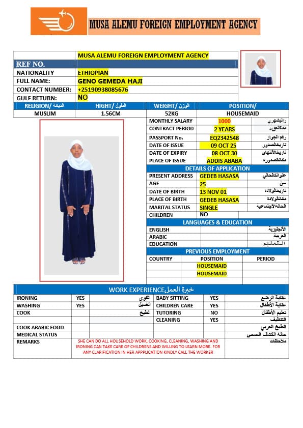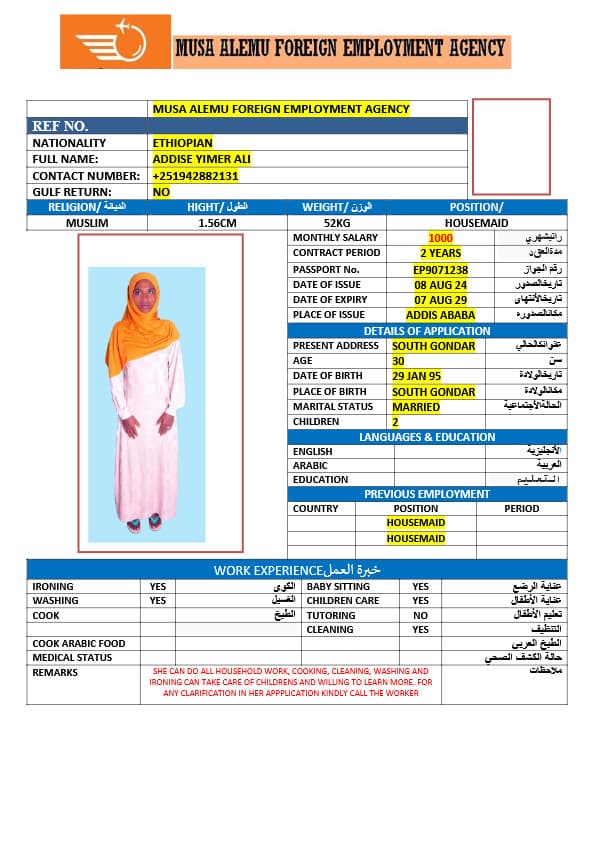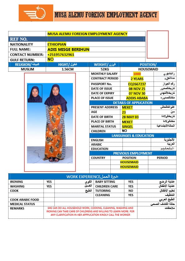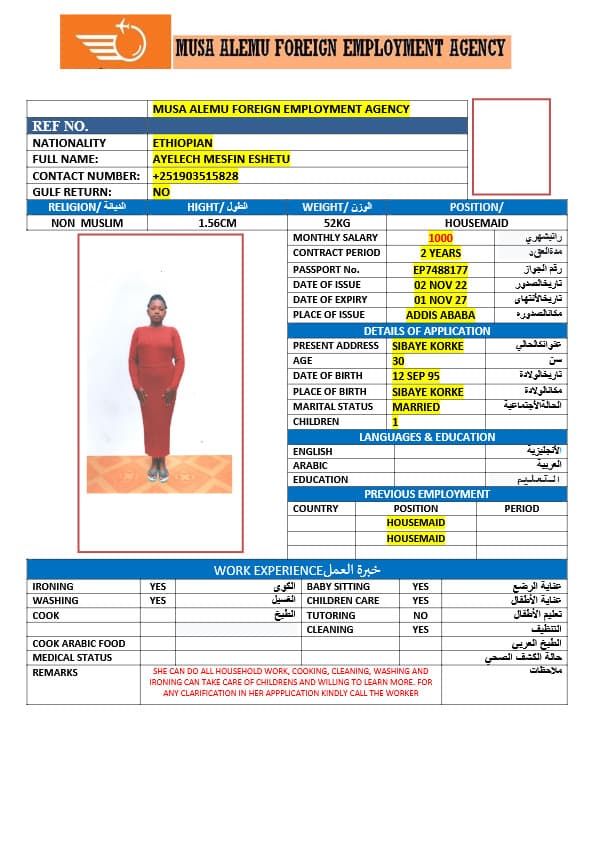 احصل على خدمة استقدام عاملة منزلية من أثيوبيا عبر النجوم المميزة بأعلى معايير الجودة والشفافية. نقدّم لك قوائم سير ذاتية لعمالة منزلية إثيوبية مع تفاصيل الخبرة والمهارات والسعر الشهري، مما يمكّنك من اختيار العاملة المناسبة لاحتياجات منزلك بكل ثقة وسهولة. مع خدماتنا، تضمن إجراءات نظامية، دعم كامل، متابعة خطوة بخطوة، واختيار أمثل من بين العديد من المرشحات المؤهلات للعمل في المنازل. ابدأ الآن واستفيد من استقدام موثوق وسريع بأسعار تنافسية!